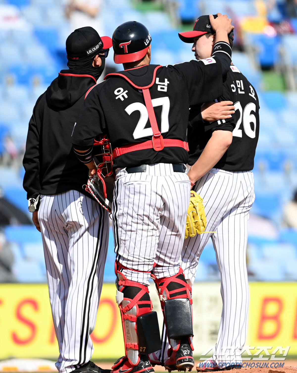 2021 KBO리그 LG 트윈스와 한화 이글스의 경기가 25일 대전 한화생명 이글스파크에서 열렸다. 6회말 LG 이민호가 김대유와 교체됐다. 마운드에 올라 이민호를 격려하는 경헌호 코치의 모습. 대전=허상욱 기자 wook@sportschosun.com/2021.04.25/
