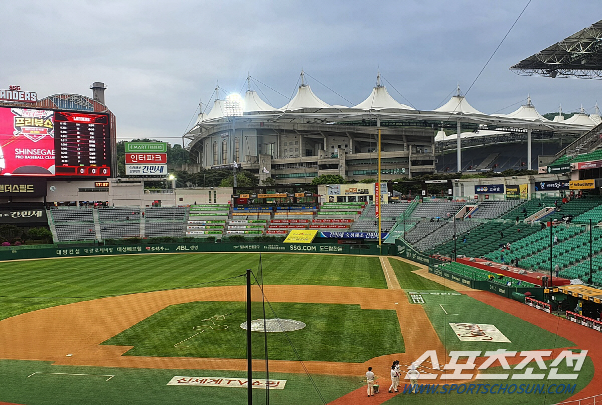 그라운드에도 방수포가 등장했다. 많은 양의 비가 아닌 만큼, 내야 그라운드를 다 덮지는 않고 마운드만 방수포로 덮은 채 그라운드 정비를 하며 경기 개시를 기다렸다. 경기도 정상적으로 시작될 예정이다.