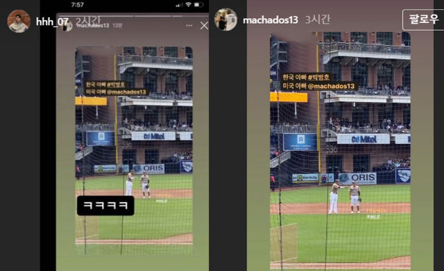 영상 속 김하성은 마차도에게 조언을 구하는 모양새다. 마차도는 손짓을 곁들여 열정적으로 이야기하고 있다.