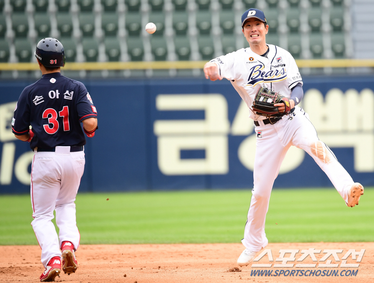 2021 KBO리그 두산베어스와 롯데자이언츠의 경기가 23일 서울잠실야구장에서 열렸다. 두산 유격수 김재호가 9회초 무사 1루에서 한동희 병살타때 1루주자 손아섭을 2루에서 포스아웃 시키고 있다. 잠실 =최문영 기자 deer@sportschosun.com