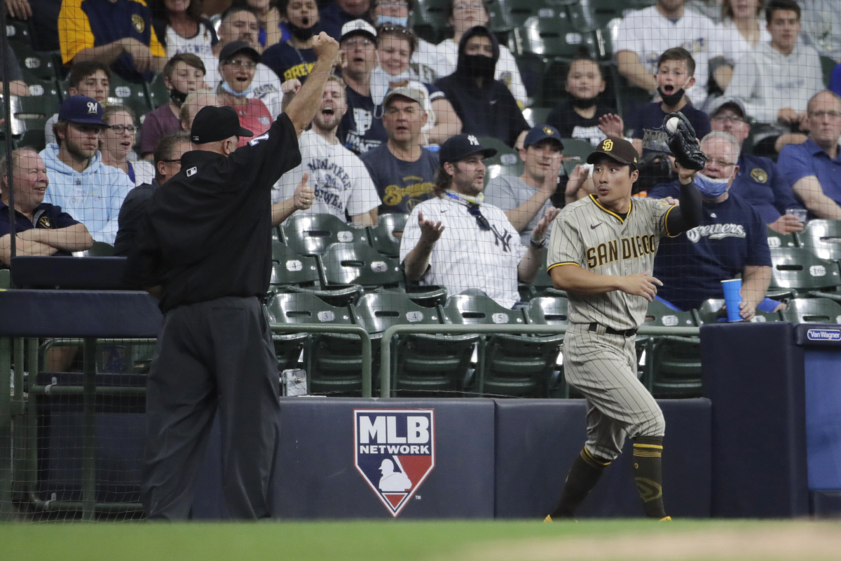 샌디에이고 파드리스의 김하성이 26일(한국시각) 밀워키 브루어스전서 2회초 나르바에즈의 파울 타구를 잡아 아웃시켰다. AP 연합뉴스