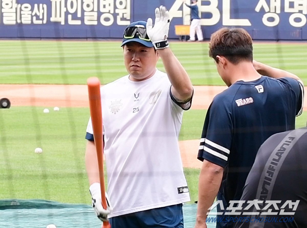 허경민은 양의지 방망이를 뺏어 타격폼을 따라 하기도 했다. 양의지는 김재환, 김재호와도 한참 동안 대화를 나눴다.