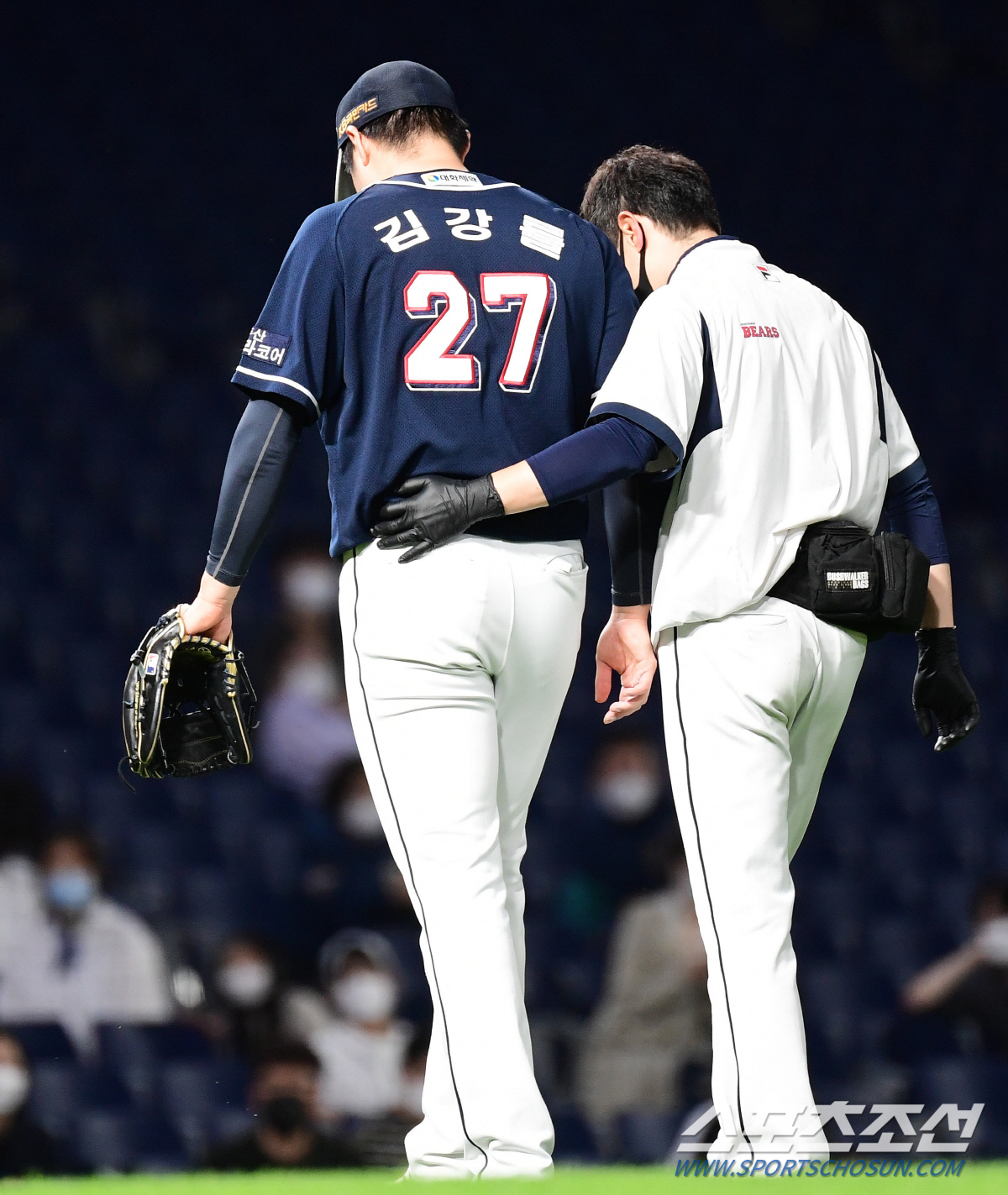 김강률은 전날 NC전서 4-3으로 앞선 9회말 등판해 1사 1루 상황에서 대타 박석민을 상대로 초구 124㎞ 커브를 던지다 중심을 잃고 삐끗하면서 오른쪽 햄스트링 통증을 호소했다. 트레이너가 마운드로 가 김강률의 상태를 살폈고, 더이상 투구가 힘들다고 판단해 마운드를 내려갔다.
