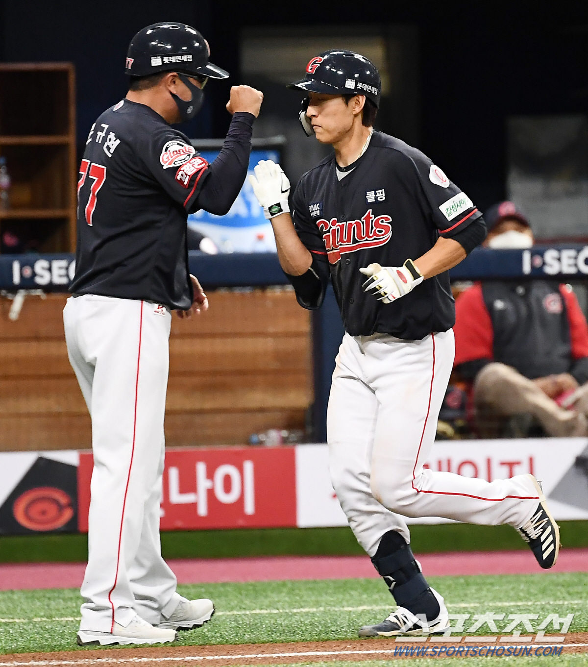 | 2021 KBO리그 키움 히어로즈와 롯데 자이언츠의 경기가 2일 고척스카이돔에서 열렸다. 3회초 무사 3루 롯데 마차도의 적시타 때 홈을 밟은 강로한이 더그아웃으로 들어서고 있다. 고척=박재만 기자 pjm@sportschosun.com/2021.06.02/ |