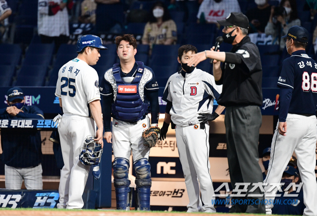 2일 창원 NC파크에서 KBO리그 NC와 두산의 경기가 열렸다. 두산 장승현 포수가 4회 박석민의 파울타구를 잡고 덕아웃에서 넘어졌다. 3루주자 양의지의 득점을 인정하고 있는 심판진. 창원=송정헌 기자 songs@sportschosun.com/2021.06.02/