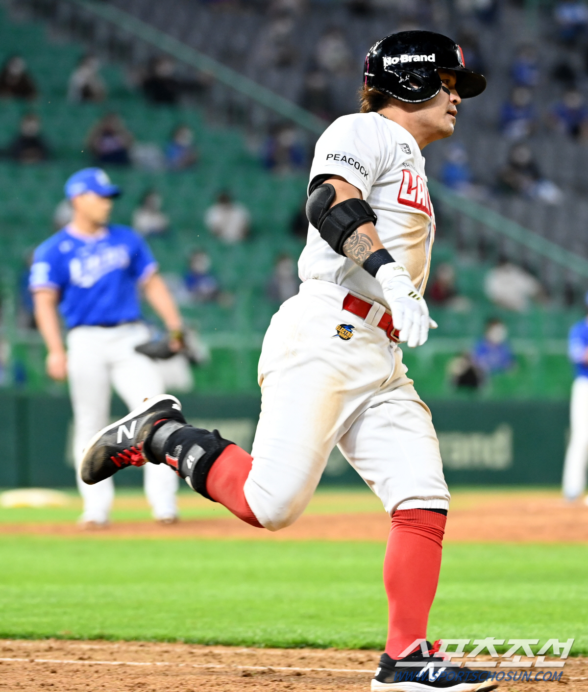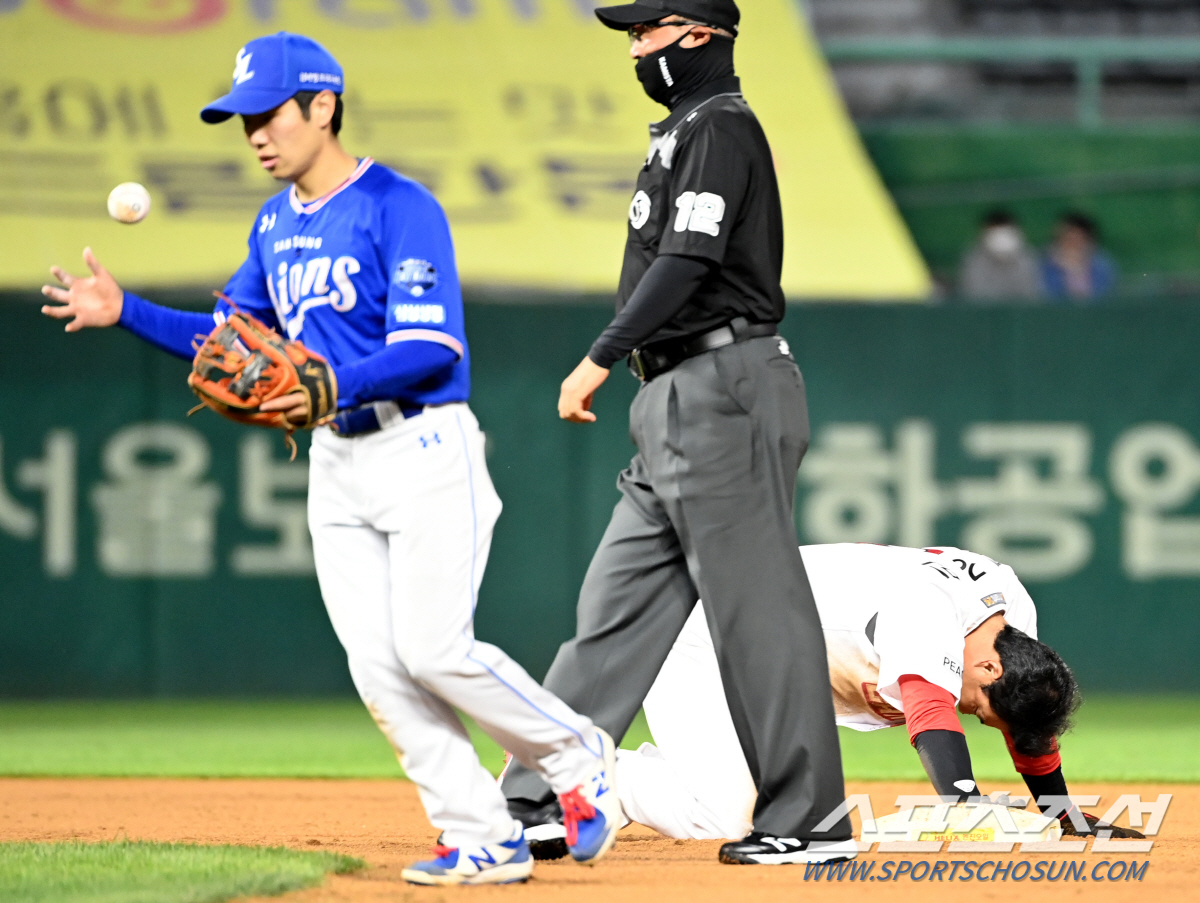 포수 김민수는 공을 빠뜨리지 않으려 온몸으로 투구를 막아냈고 기회를 놓치지 않은 김강민은 3루로 가기 위해 몸을 움직였다.