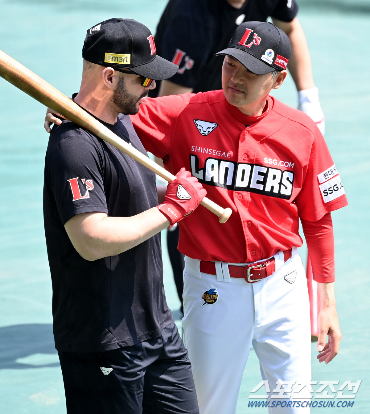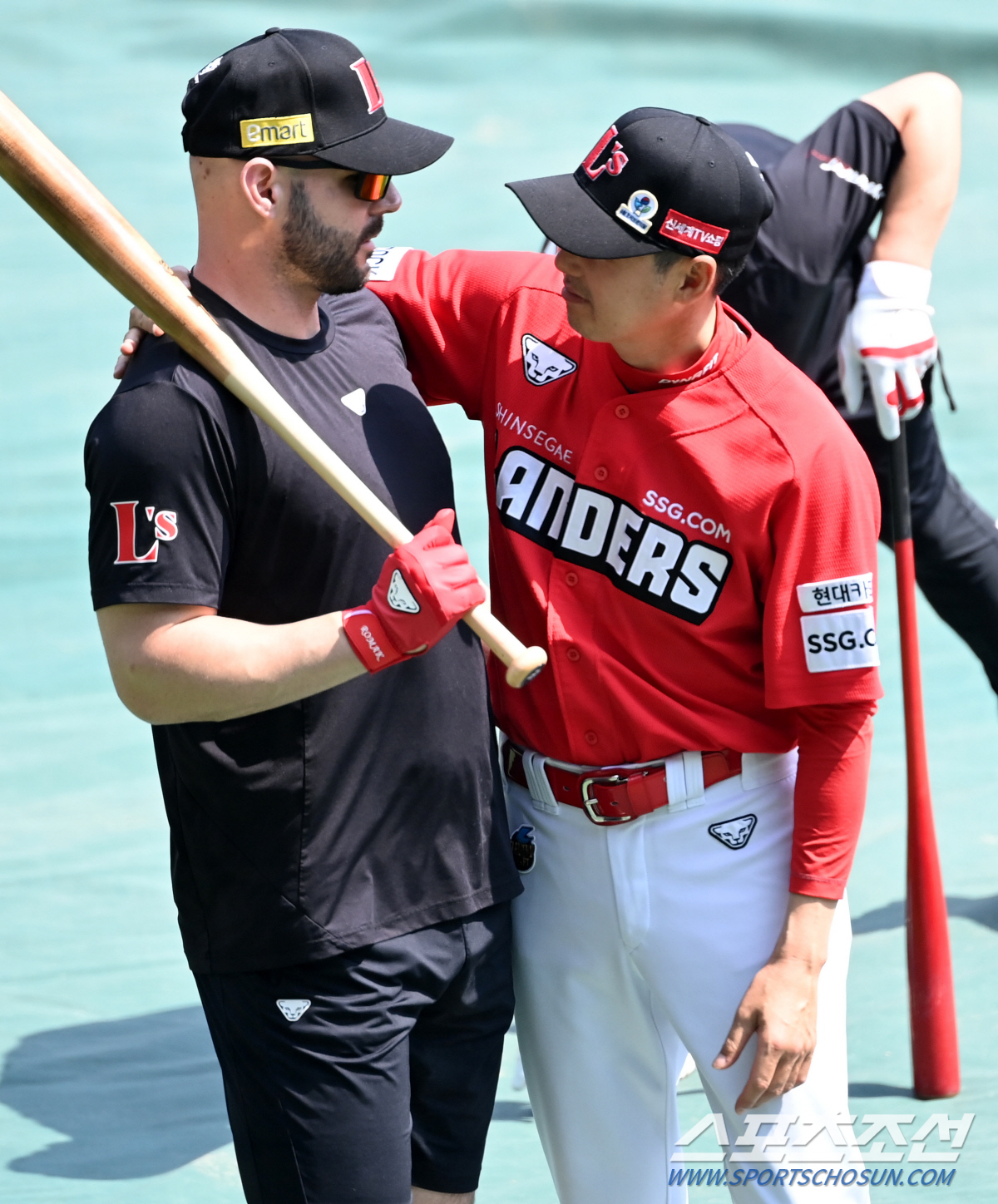 5일 잠실구장에서 SSG와 두산의 경기가 열린다. 김원형 감독은 타격연습에 나선 로맥에게 다가와 하이파이브로 인사를 나눈 후 통역을 불러 직접 이야기를 전했다.