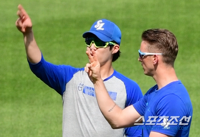 완벽한 자기 관리로 성공적인 KBO리그 2년 차 시즌을 보내고 있는 뷰캐넌. 후배를 가르치는 모습에서도 완벽주의가 그대로 드러났다.