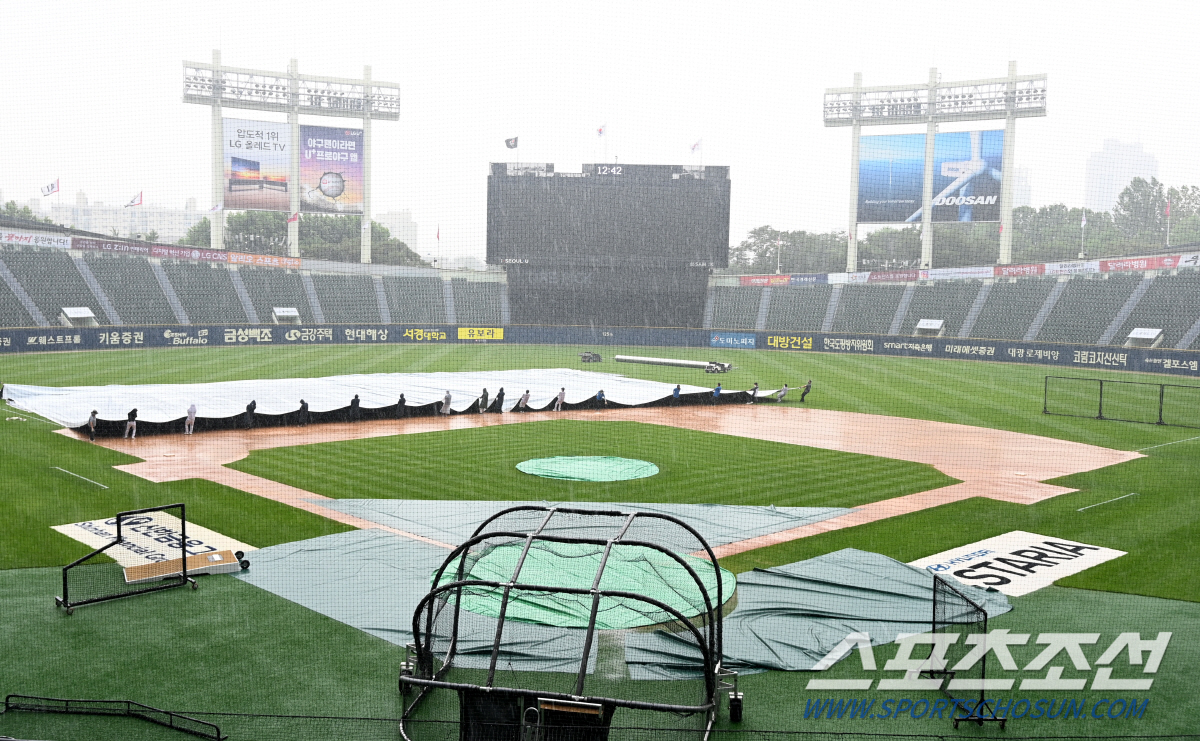 [잠실=스포츠조선 권인하 기자]잠실에서 열릴 예정이던 KT 위즈-LG 트윈스 더블헤더 1차전이 우천으로 취소됐다. 비가 내리지 않았던 잠실구장에 낮 12시 30분 이후 비가 내리기 시작했고 이내 천둥과 번개를 동반한 폭우가 내렸다. 갑작스런 비에 방수포도 덮지 못해 야구장 내야에 빗물이 흥건히 고이면서 경기 시작이 쉽지 않게 됐고, 결국 1차전이 취소 결정이 내려졌다. 2차전은 오후 6시30분에 열린다.