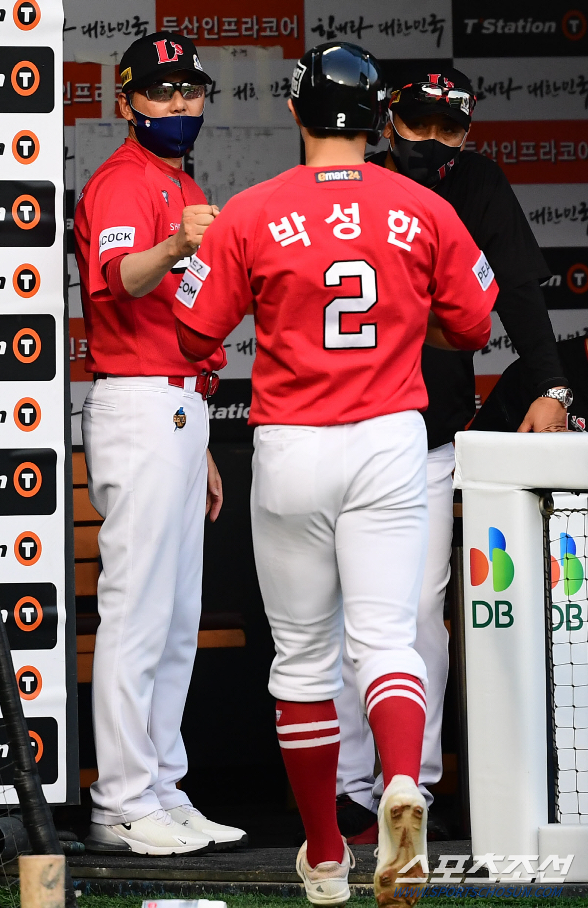 2021 KBO리그 두산베어스와 SSG랜더스의 경기가 6일 서울 잠실야구장에서 열렸다. SSG 김원형 감독이 8회초 1사 1,2루에서 최정 적시타때 역전 득점을 올린 박성한을 맞이하고 있다. 잠실 =최문영 기자 deer@sportschosun.com /2021.06.06/