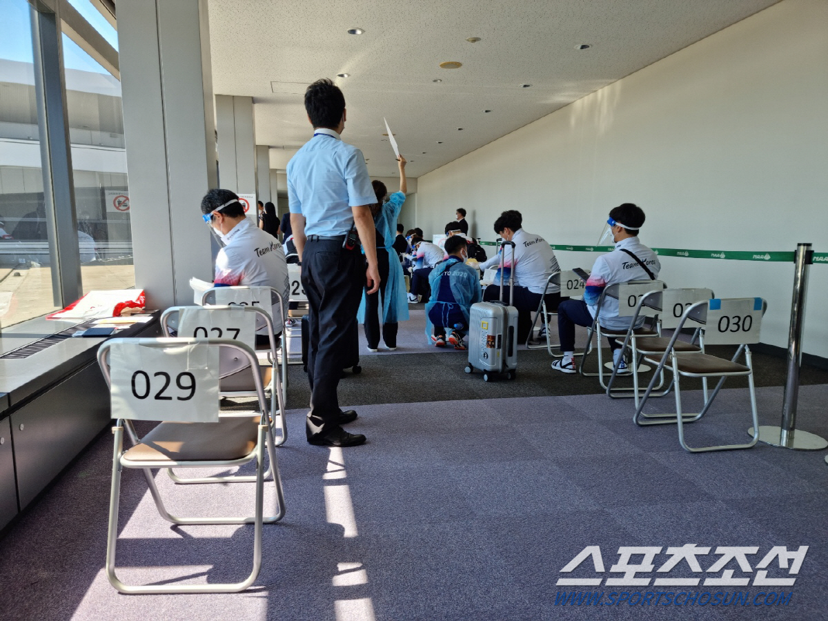 절차는 같았다. 일반인 승객이 모두 내린 뒤 올림픽 관계자들이 항공기에서 내리자 방역 관계자가 선수-관계자를 따로 식별해 줄을 세웠다. 선수들이 먼저 이동하고, 관계자들이 뒤를 잇는 식이었다. 복도에 한 줄로 길게 늘어선 의자에 앉아 여권과 일본 입국 서류, 96시간, 72시간 전 받은 코로나19 검사 결과지 등을 제대로 작성했는 지, 검역-입국 단계에서 개인정보 확인 QR코드 생성에 필요한 옷차 작동 여부를 확인했다. 이후 서류 검증을 거친 뒤엔 타액 샘플 채취에 들어갔다. 비행기에서 내린 순간부터 샘플 채취까지 소요된 시간은 40분 정도였다. 검사 결과를 기다리는 동안 대기 장소에서 곧바로 올림픽 AD카드를 수령 받았고, 1시간 정도 기다린 뒤 음성 확인을 받은 이부터 입국심사대로 향할 수 있었다. 이미 일반 승객이 빠져나간 뒤라 입국심사는 곧바로 이뤄졌고, 항공기에 실은 짐도 이미 나와 있었다. 이날 공항에서 만난 대회 관계자는 "오늘은 아침에 도착한 인원이 적어 빠르게 진행된 편"이라고 말했다.