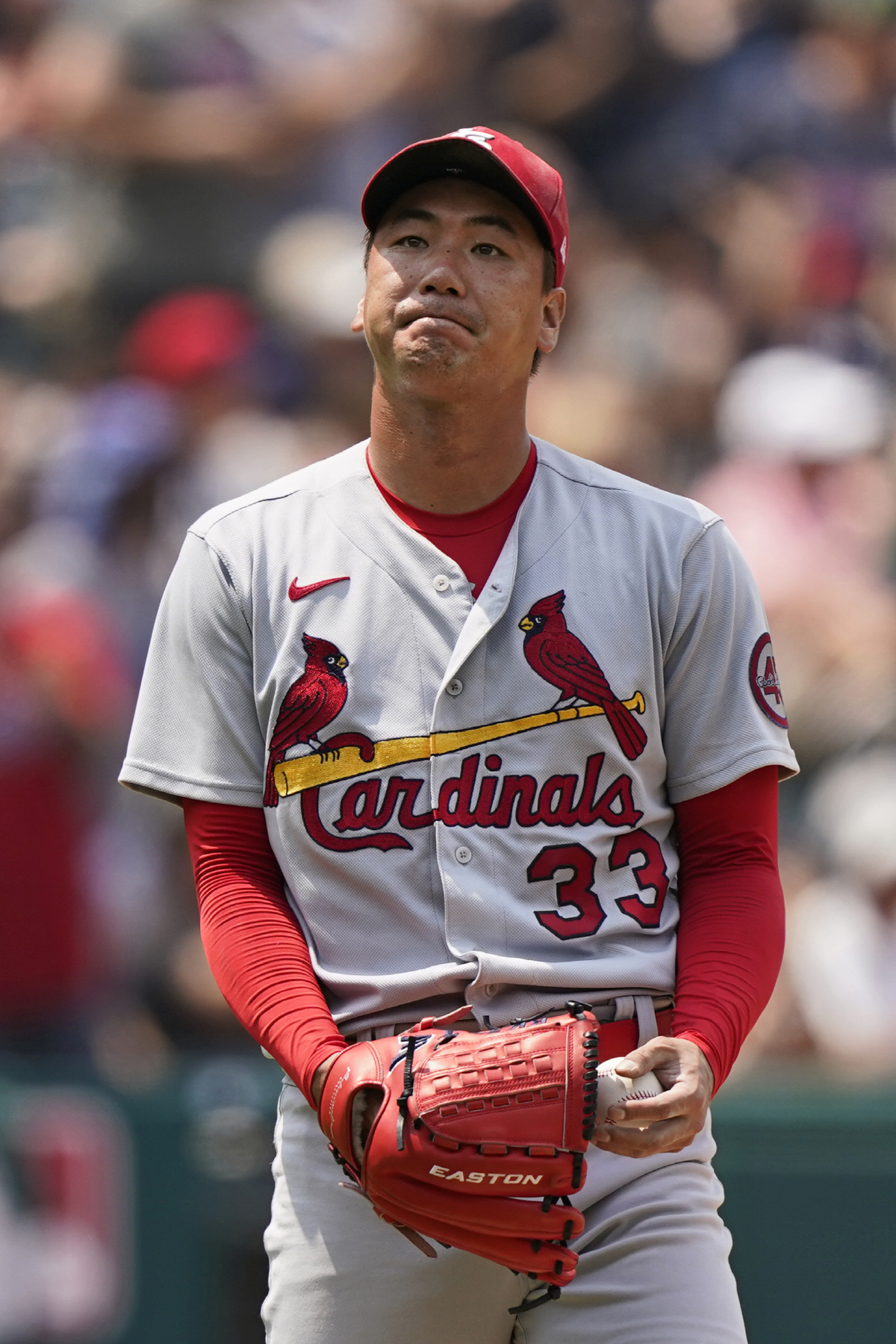 세인트루이스 카디널스 김광현이 29일(한국시각) 클리블랜드 인디언스전에서 3회말 호세 라미레즈에게 솔로홈런을 내준 뒤 허탈한 표정을 짓고 있다. AP연합뉴스