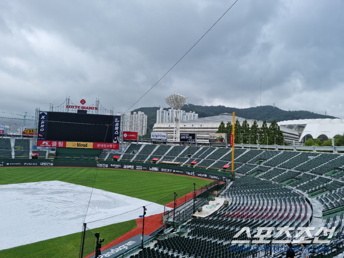 사직구장에는 내야 전체를 덮는 초대형 방수포가 덮여있다. 전날 경기 막판에 확인됐던 내야 물구덩이의 흔적도 엿보인다.