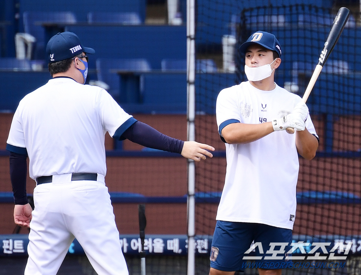 20일 창원NC파크에서 NC 다이노스와 LG 트윈스의 경기가 열린다. 경기 전 NC 선수들이 훈련했다. 강진성에게 타격에 대한 조언을 해주고 있는 이동욱 감독. 창원=송정헌 기자 songs@sportschosun.com/2021.08.20/