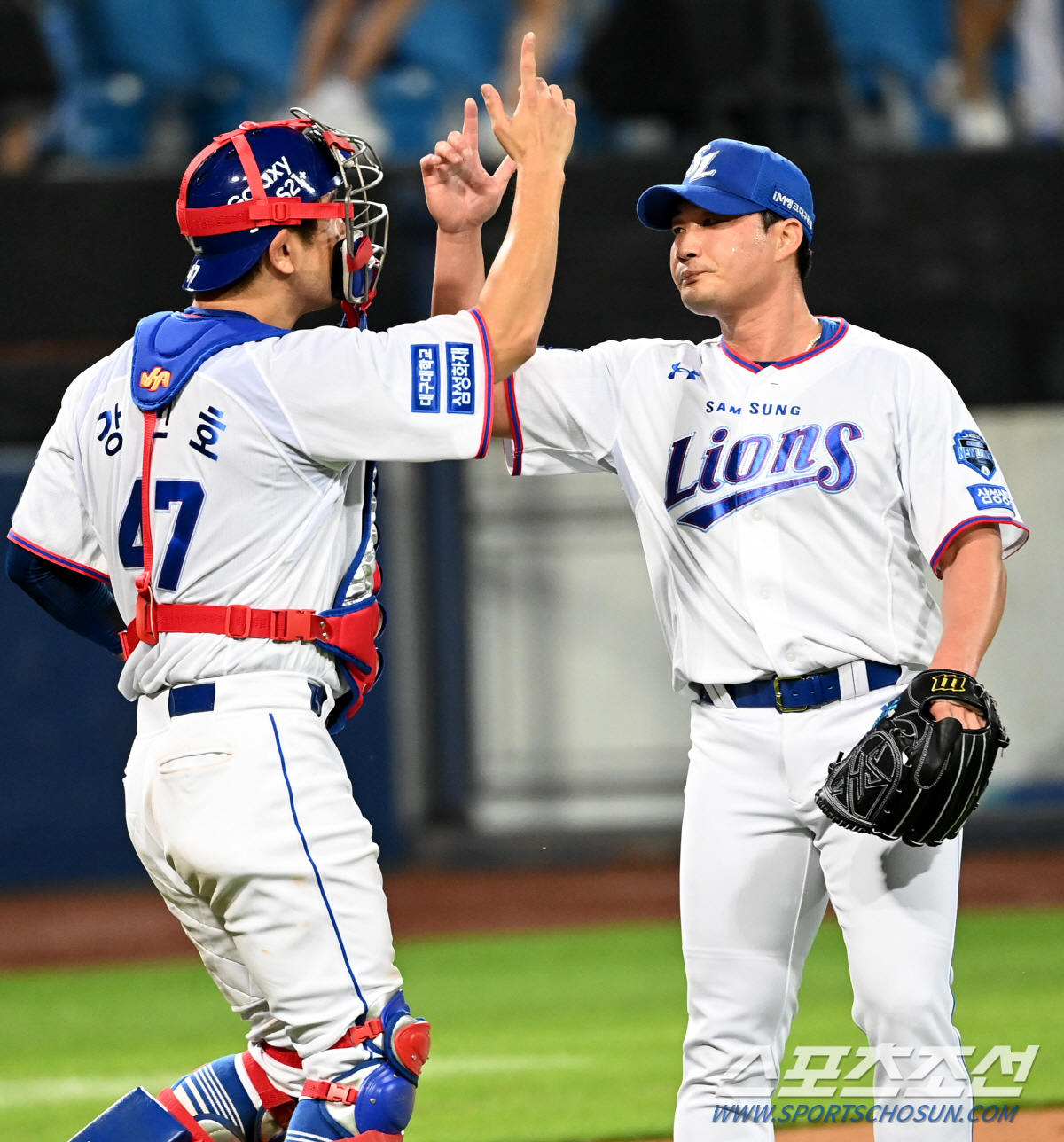 2021 KBO리그 롯데 자이언츠와 삼성 라이온즈의 경기가 10일 대구 삼성라이온즈파크에서 열렸다. 삼성이 3대2로 승리했다. 경기 종료 후 오승환-강민호 배터리가 기쁨을 나누고 있다. 대구=허상욱 기자 wook@sportschosun.com/2021.07.10/