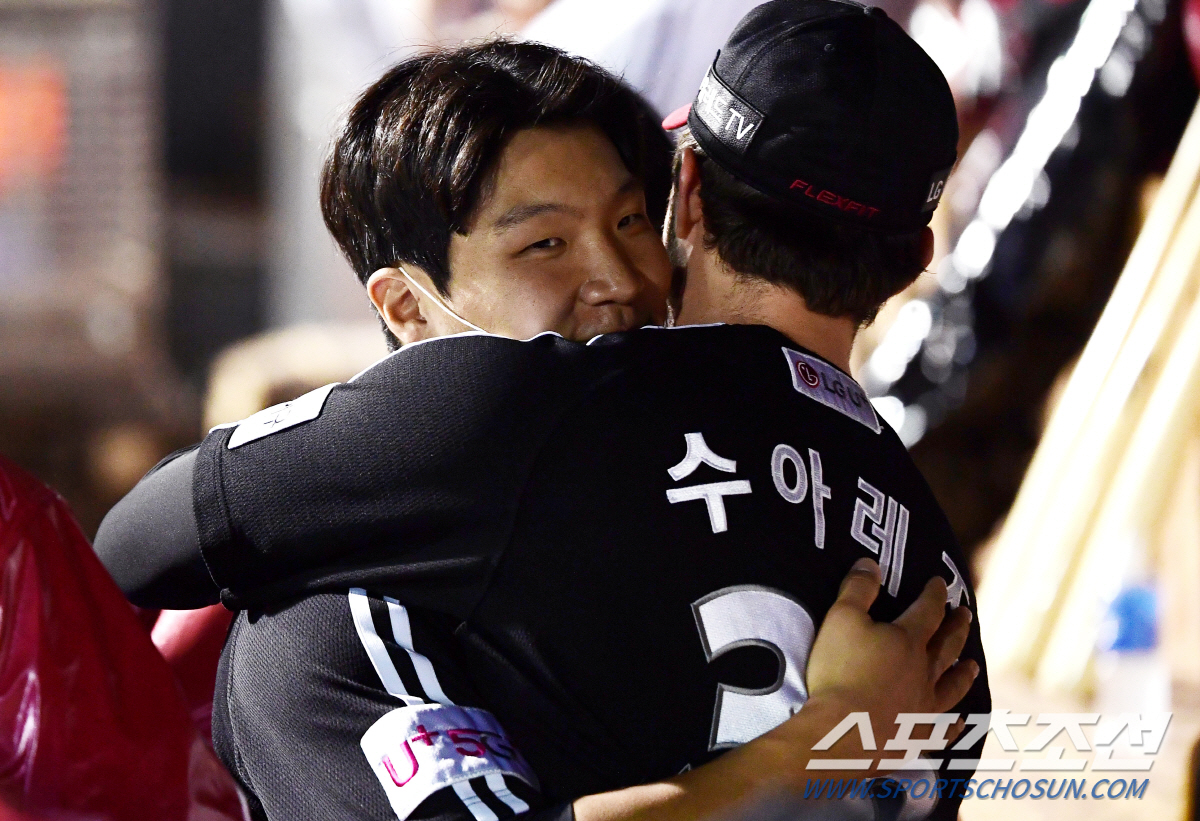 | 27일 대전 한화생명이글스파크, KBO리그 LG와 한화 경기. 수아레즈가 5이닝 무실점으로 호투한 후 7-0으로 앞선 가운데 이닝을 마쳤다. 문보경이 축하하고 있다. 대전=정재근 기자 cjg@sportschosun.com/2021.10.27/ |