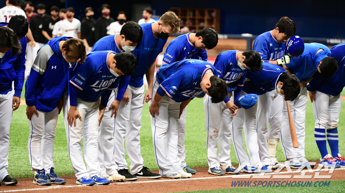 | 2021 KBO리그 삼성라이온즈와 키움히어로즈의 경기가 27일 서울 고척스카이돔에서 열렸다. 삼성 선수들이 키움을 상대로 3대8 패배를 확정짓고 관중들에게 답례하고 있다. 고척=최문영 기자 deer@sportschosun.com /2021.10.27/ |
