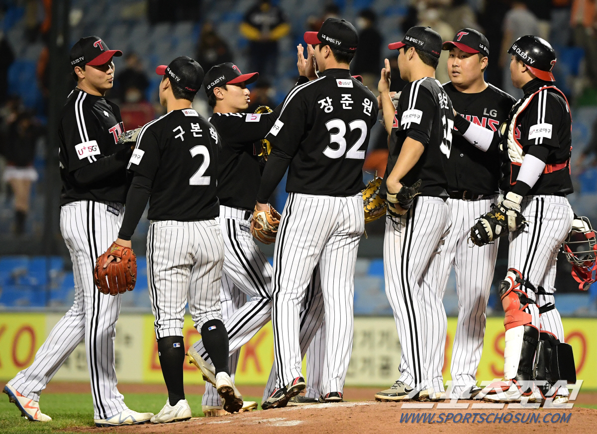 | 27일 대전 한화생명이글스파크, KBO리그 LG와 한화 경기. 9대1로 승리한 LG 선수들이 기쁨을 나누고 있다. 대전=정재근 기자 cjg@sportschosun.com/2021.10.27/ |