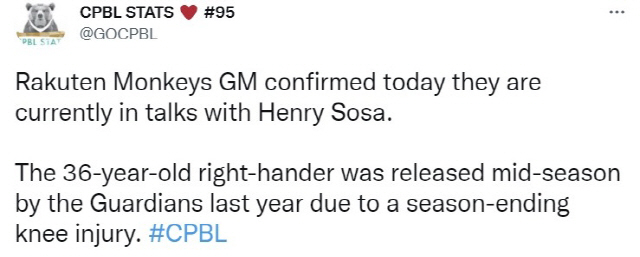 [스포츠조선 김진회 기자] '파이어볼러' 헨리 소사(37)가 다시 대만프로야구(CPBL)에 뛸 가능성이 높아졌다.