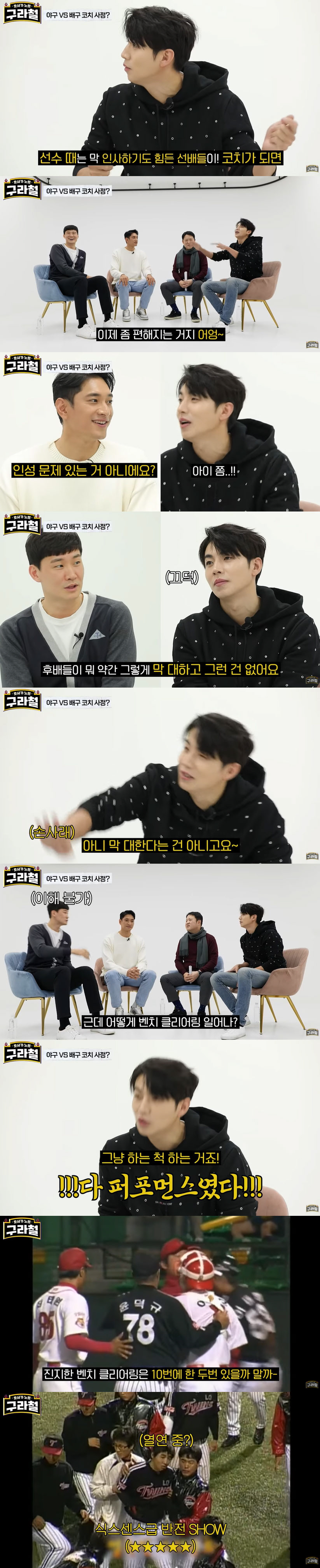 이에 이대형은 "그냥 편해진다는 거다"고 발끈했다. 그러면서 "그렇다고 선수들한테 뭐라고 할 수도 없다. 지금 감독님 하시는 분들이 정말 대단하신 거다. 그 어려운 것들을 다 이겨내신 분들이다"고 말했다.