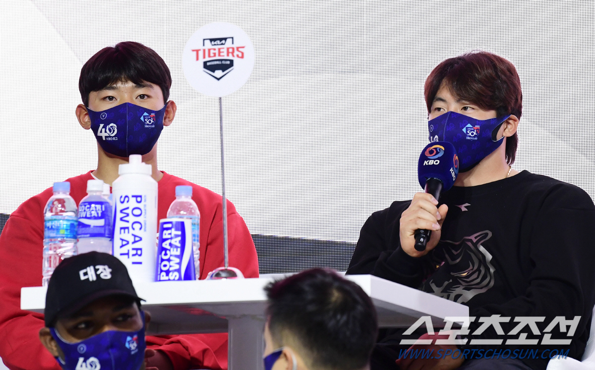김도영은 '나성범 선배의 장타 비법을 전수 받았느냐'는 질문에 "보고 있는 것 만으로도 도움이 된다"며 웃었다.