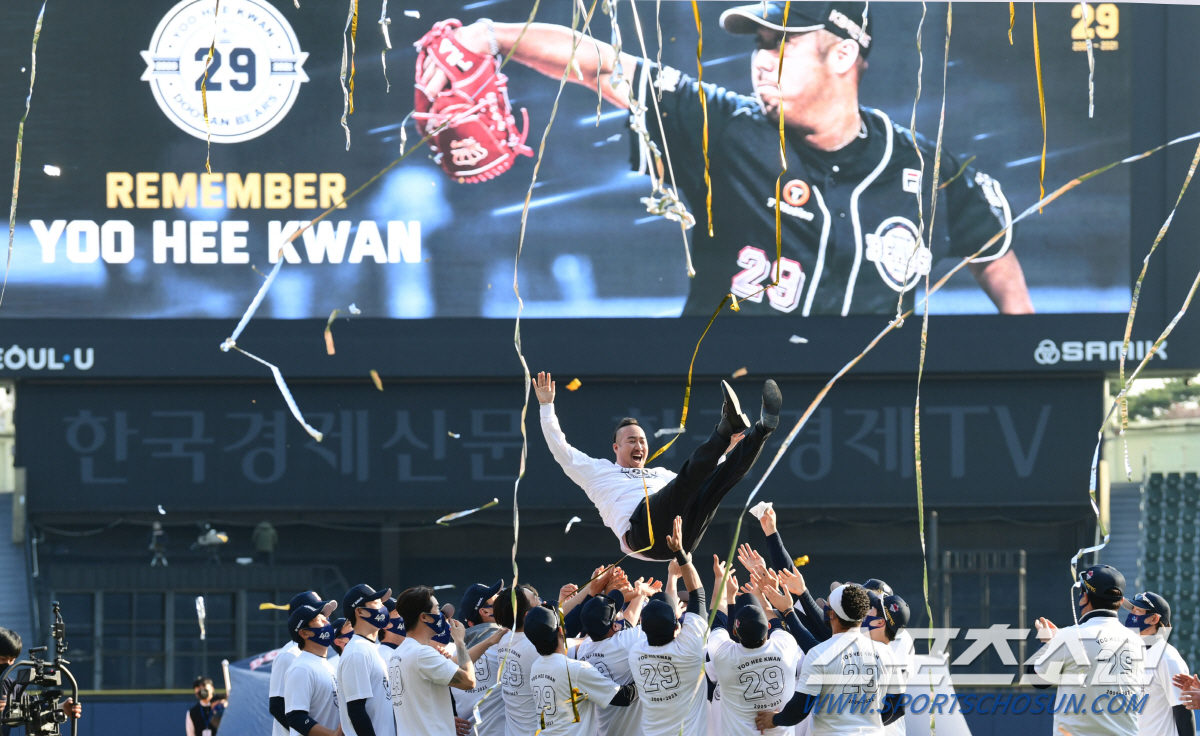 1루측 덕아웃에서 은퇴식을 지켜보던 두산 동료들은 29번이 새겨진 티셔츠 차림으로 마운드 위 유희관에게 다가와 기념촬영과 함께 헹가레로 옛 동료의 꽃길 같은 미래를 기원했다. 유희관은 1루측 팬들에게 다가가 손을 흔들며 마지막 인사를 전했다.