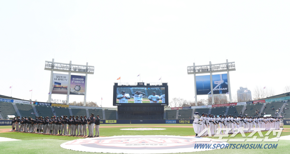 2022 KBO리그 개막전 두산베어스와 한화이글스의 경기가 2일 서울 잠실야구장에서 열렸다. 경기전, 양팀 선수들이 도열한 한 가운데 선수단 소개가 이루어 지고 있다. 잠실=최문영 기자 deer@sportschosun.com/2022.04.02/