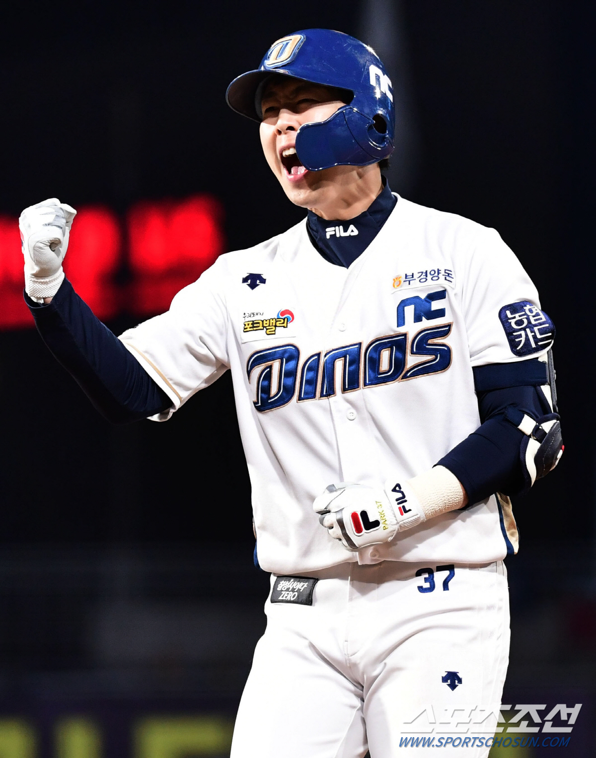 [창원=스포츠조선 송정헌 기자] '얼마나 마음고생 심했으면...' 2타점 적시타를 날린 박건우가 동료들을 향해 포효했다.