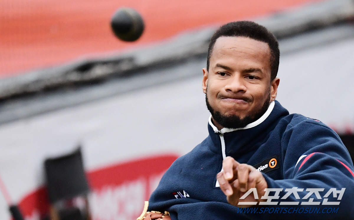 미란다는 13일 수원 케이티위즈파크에서 모레노 트레이닝 코치의 지도를 받으며 재활 훈련을 했다. 미란다는 무거운 메디신볼을 던지며 컨디션을 조절했다.