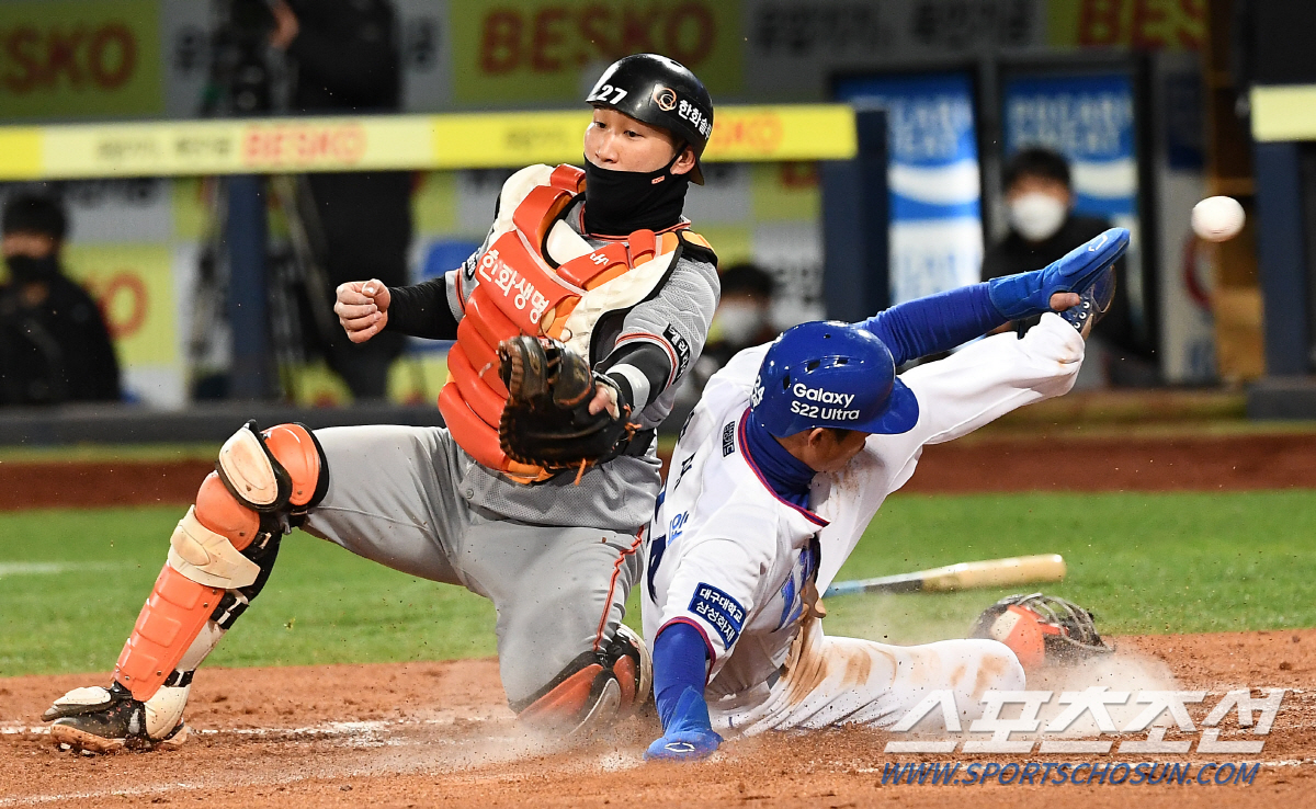 하지만 3루주자는 오선진 대주자로 투입된 최고의 준족 김지찬이었다. 앞으로 달려나오며 포구한 중견수 이원석이 송구했지만 김지찬은 주저 없이 홈을 향해 달렸다. 투바운드 된 송구를 포수가 캐치하지 못하는 사이 김지찬의 슬라이딩한 손이 홈플레이트를 빠르게 쓸고 지나갔다. 5-3으로 달아나는 희생플라이. 김재혁의 데뷔 첫 타점이 중요한 타이밍에 완성되는 순간이었다.