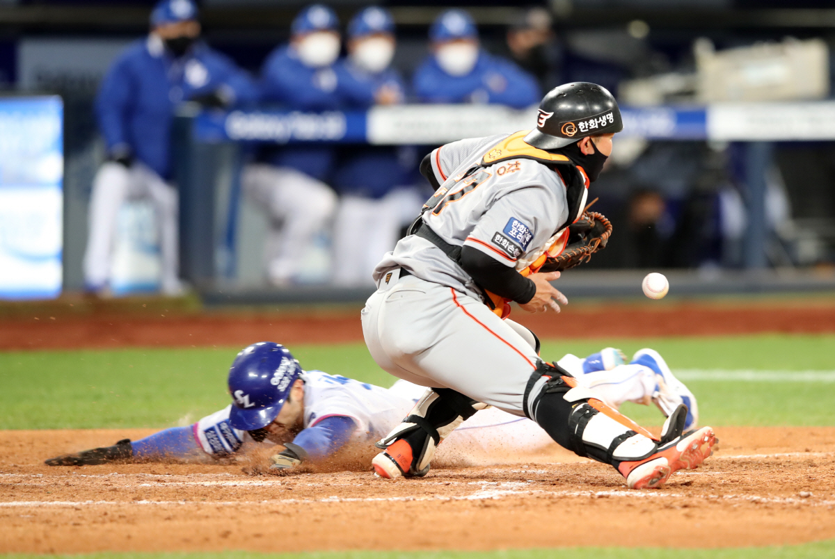 2022 KBO리그 삼성 라이온즈와 한화 이글스의 경기가 14일 대구 삼성라이온즈파크에서 열렸다. 3회말 2사 1.2루 삼성 피렐라의 안타 때 2루 주자 김재혁이 홈을 파고들고 있다. 대구=박재만 기자 pjm@sportschosun.com/2022.04.14/