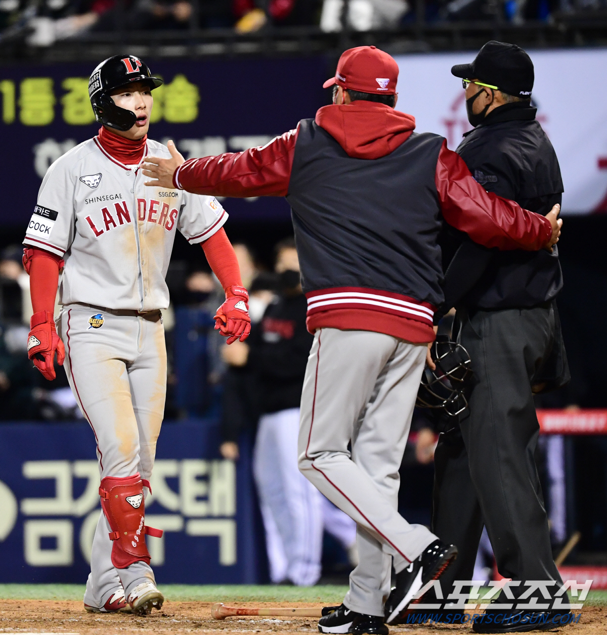 이때 SSG 김원형 감독이 곧장 튀어나와 항의를 했다. 명백한 파울이었다는 것이다. 문보경이 잡는 위치도파울라인 밖이었고, 잡았을 때의 미트 위치도 페어 지역이라고 보긴 어려웠다. 하지만 내야의 땅볼 타구라서 비디오 판독 대상이 아니었고, 김 감독의 강력한 항의에도 번복되지 않고 경기는 그대로 속행됐다. 중계방송의 리플레이 화면상으론 파울이 분명해 보였지만 구제할 방법이 없었다.