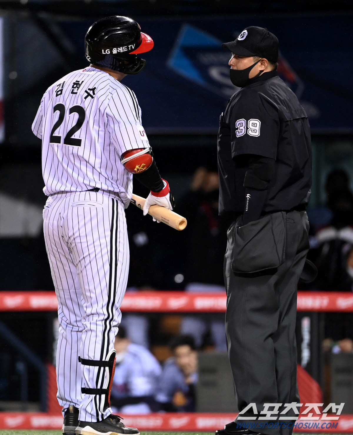 | SSG 랜더스와 LG 트윈스의 2022 KBO 리그 경기가 13일 잠실야구장에서 열렸다. 5회말 2사 만루 LG 김현수가 SSG 오원석에 삼진을 당한 후 구명환 구심에게 어필하고 있다. 잠실=허상욱 기자wook@sportschosun.com/2022.04.13/ |