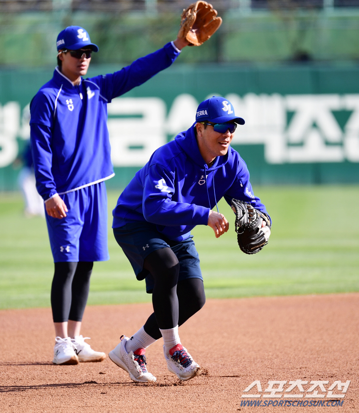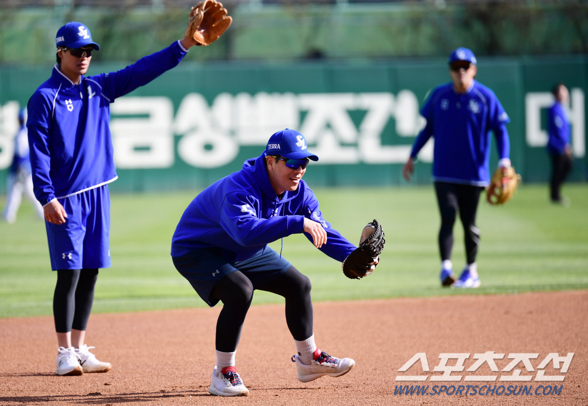 후배들과 함께 수비 훈련을 한 강민호는 힘차게 파이팅도 외치며 훈련 분위기를 이끌었다. 짧게 굴러오는 내야 땅볼 타구를 맨손으로 잡아 1루에 힘차게 송구하는 멋진 장면도 연출했다.