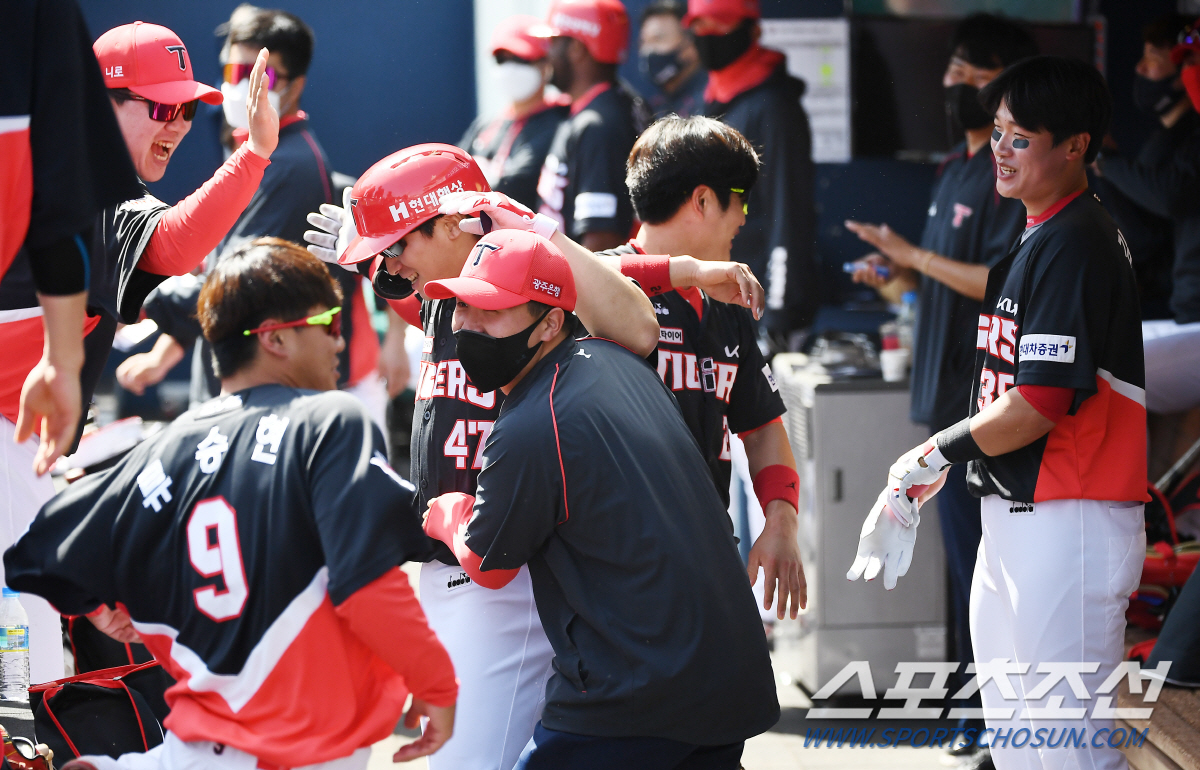 나성범의 무관심 자축 세리머니가 끝나길 기다렸던 KIA 선수들은 더그아웃 끝에서 걸어 돌아오는 나성범에게 "나이스"를 연신 외친 뒤 이적 첫 홈런을 축하했다.