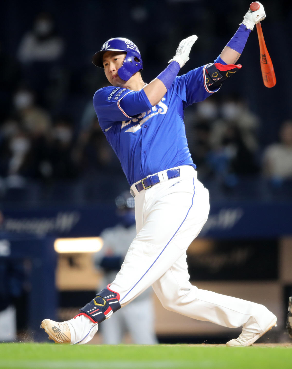 몸쪽 높게 형성된 130㎞ 짜리 포크볼을 놓치지 않고 125m 짜리 대형 홈런으로 연결했다. 직전 이닝 1점을 만회한 NC의 추격의지를 꺾는 한방.