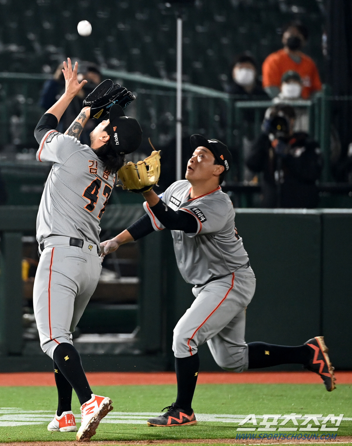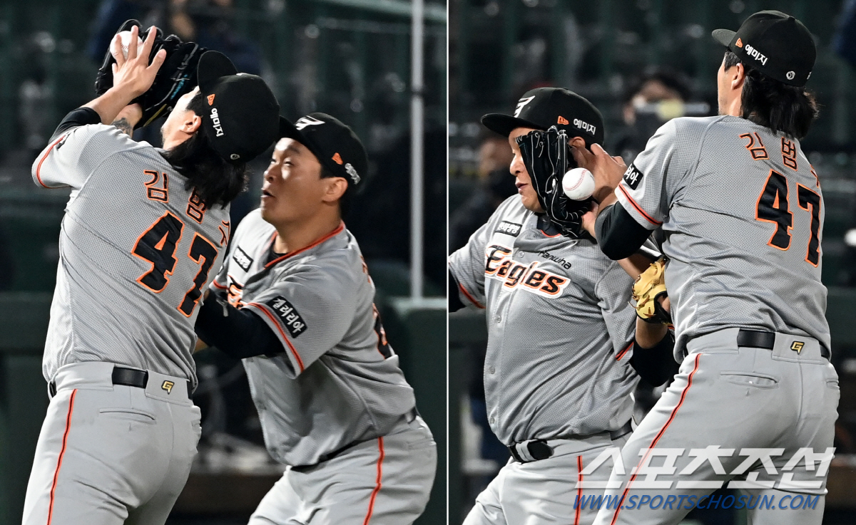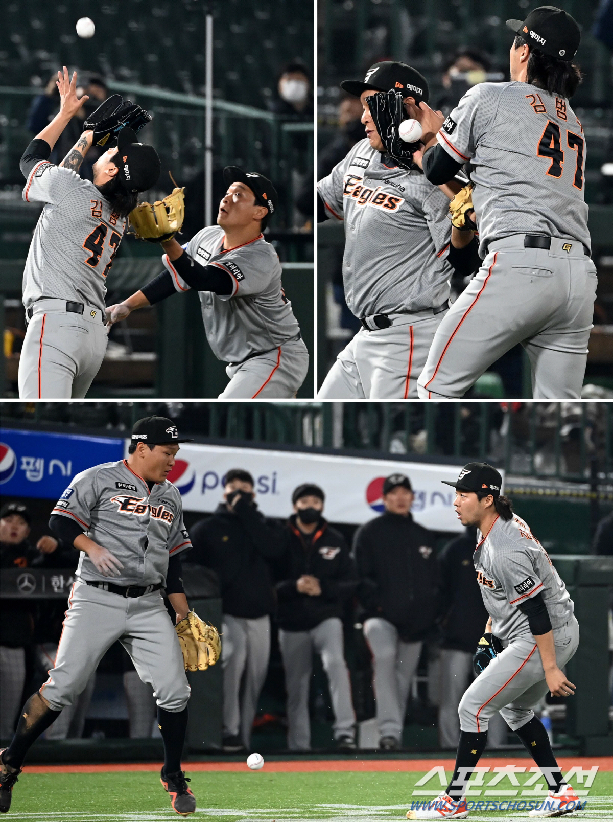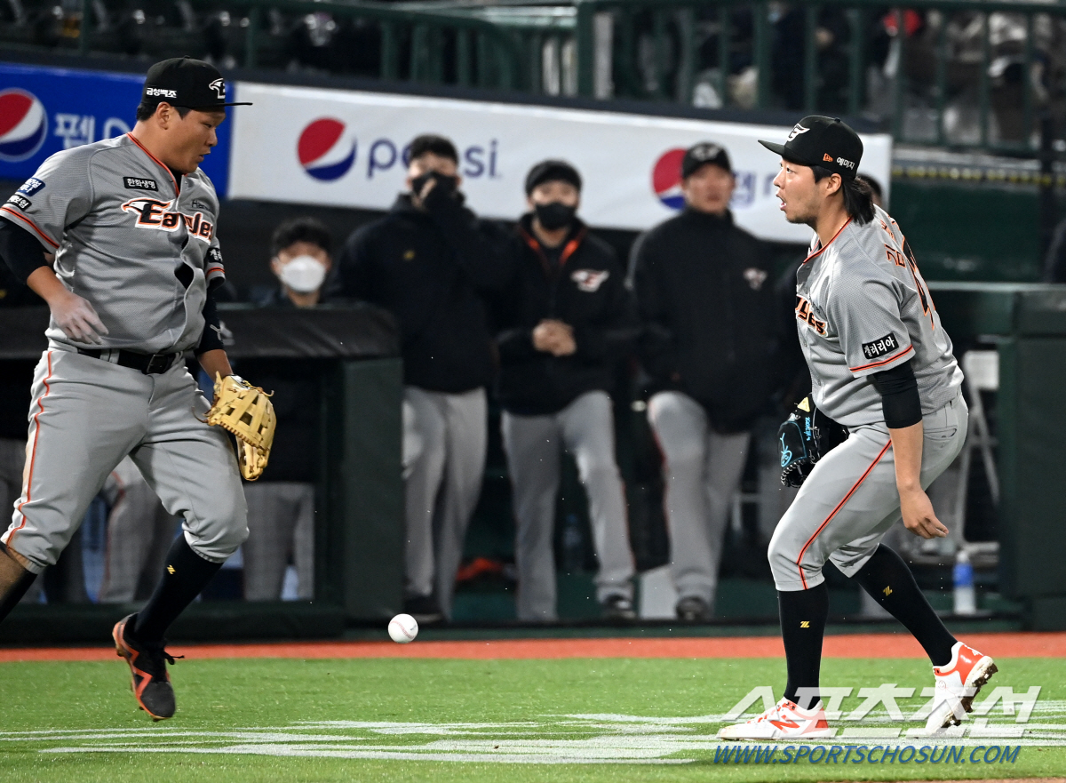 [부산=스포츠조선 허상욱 기자] 한화 김범수와 김태연이 콜 플레이 미스로 파울플라이를 놓치는 아찔한 상황을 겪었다.