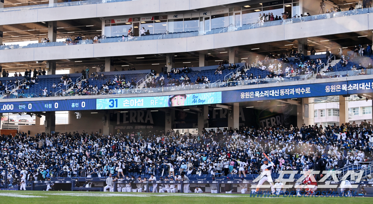 | SSG 랜더스와 NC 다이노스의 2022 KBO리그 개막전 경기가 2일 창원NC파크에서 열렸다. 경기장을 찾은 야구팬들이 응원전을 펼치고 있다. 창원=허상욱 기자wook@sportschosun.com/2022.04.02/ |