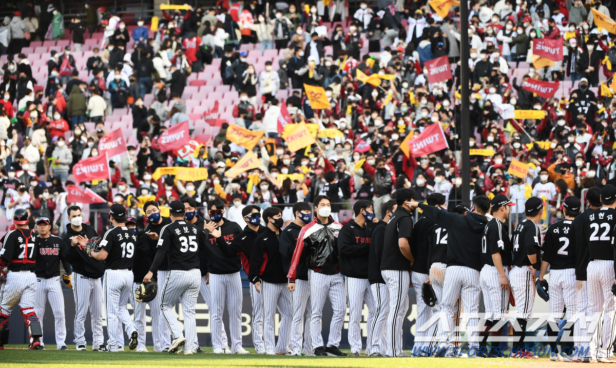 | 2022 KBO리그 개막전 KIA 타이거즈와 LG 트윈스의 경기가 2일 광주기아챔피언스필드에서 열렸다. 경기에서 9-0으로 승리한 LG 선수들이 기뻐하고 있다. 광주=박재만 기자 pjm@sportschosun.com/2022.04.02/ |