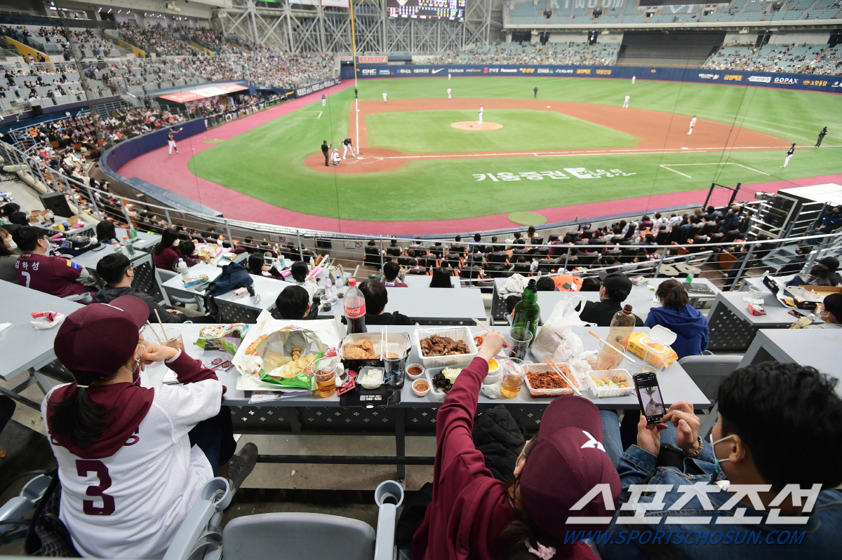 | 2일 서울 고척스카이돔. 롯데 자이언츠와 키움 히어로즈 경기. 야구팬들이 많은 음식을 먹으며 경기를 관람하고 있다. 하지만 문화체육관광부가 고척돔에서의 음식물 취식을 금지하기로 함에 따라 개막전 2경기 후엔 다시 취식이 금지된다. 고척=정재근 기자 cjg@sportschosun.com/2022.4.2/ |