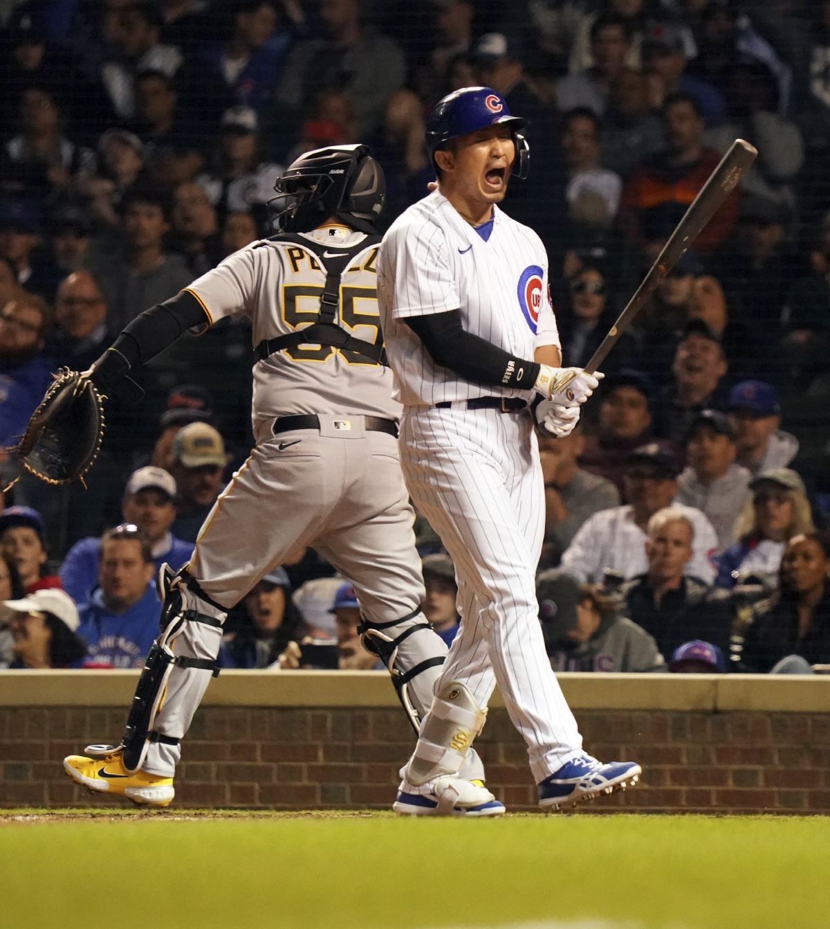 CHICAGO, ILLINOIS - APRIL 21: Seiya Suzuki #27 of the Chicago Cubs reacts after striking out in the seventh inning against the Pittsburgh Pirates at Wrigley Field on April 21, 2022 in Chicago, Illinois. Nuccio DiNuzzo/Getty Images/AFP == FOR NEWSPAPERS, INTERNET, TELCOS & TELEVISION USE ONLY ==<저작권자(c) 연합뉴스, 무단 전재-재배포 금지>