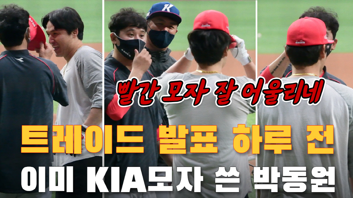 그런데 이상했던 장면, KIA 조재영 코치가 박동원에게 다가가 자신이 쓰고 있던 KIA 모자를 건냈고, 박동원이 자세를 고쳐잡으며 모자를 썼다. 그러자 조 코치와 오윤 키움 타격코치가 동시에 '잘 어울린다'는 듯한 표정으로 지켜보며 미소지었다.