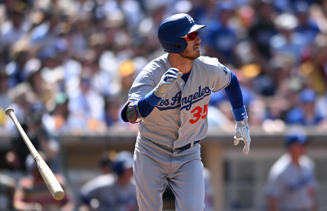 LA 다저스 코디 벨린저가 살아났다. 25일(한국시각) 펫코파크에서 열린 샌디에이고 파드리스전에서 5회초 중월 스리런홈런을 날린 뒤 타구를 바라보며 뛰쳐나가고 있는 벨린저. USATODAY연합뉴스