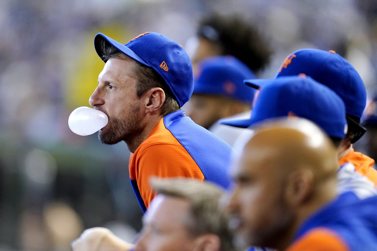 뉴욕 메츠 맥스 슈어저가 지난 25일(한국시각) 애리조나 다이아몬드백스와의 원정경기를 동료들과 더그아웃에서 지켜보고 있다. AP연합뉴스