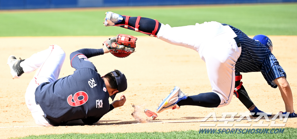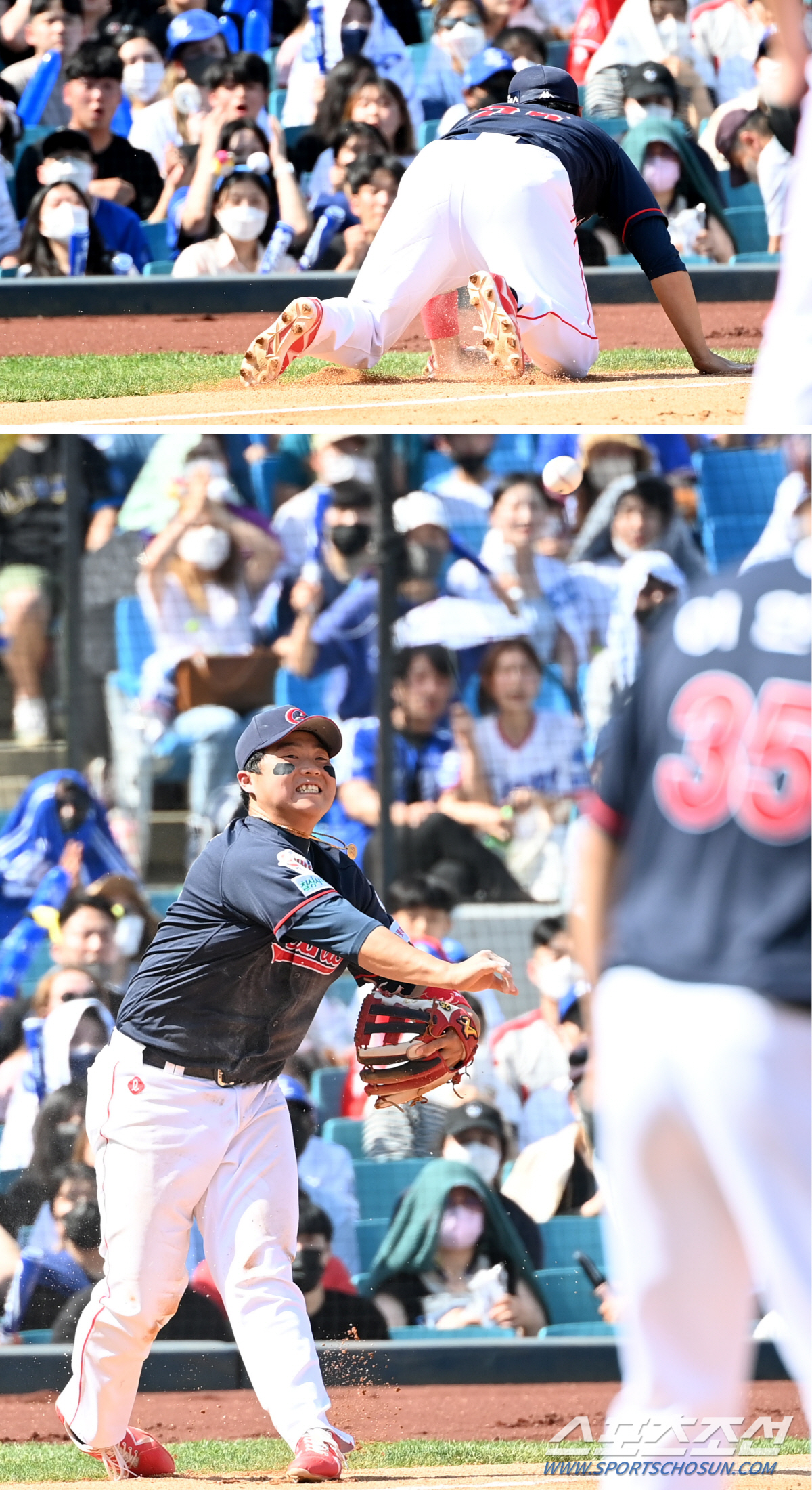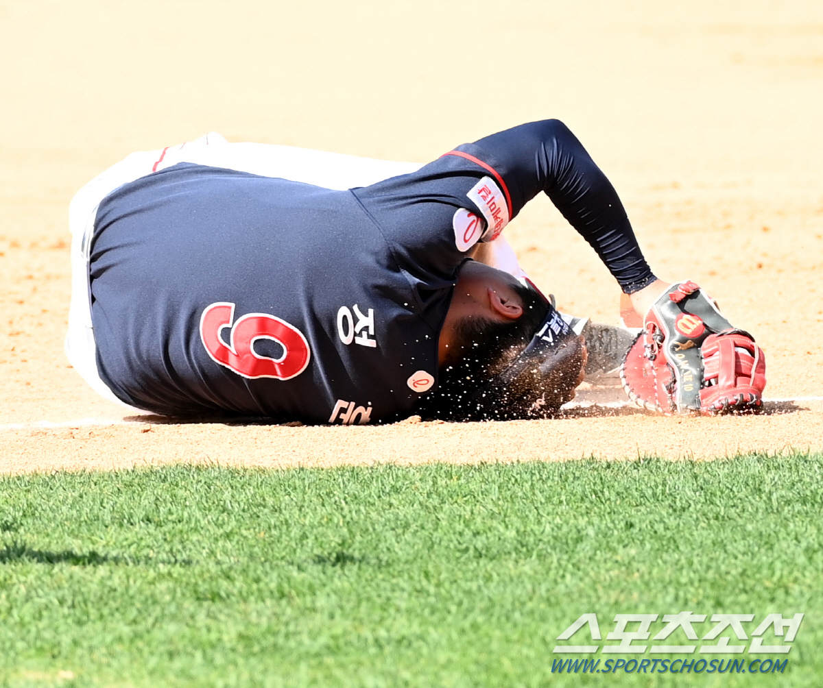 큰 고통이 이어졌던 상황, 그 찰나에도 정훈은 3루로 향한 2루주자의 움직임이 신경이 쓰였는지 순간적으로 오른손으로 공을 들고는 던지려는 자세를 취했다.
