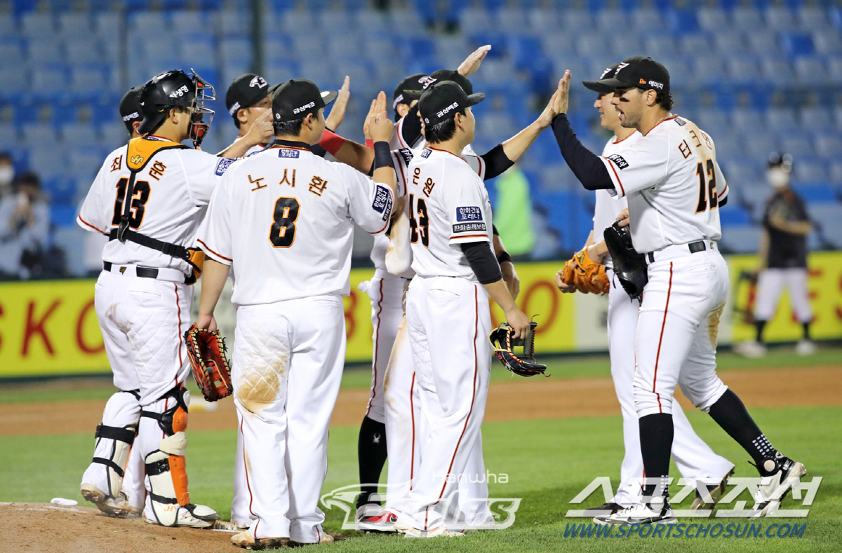 26일 히어로즈전에서 이긴 한화 선수들이 하이파이브를 하는 장면. 사진제공=한화 이글스