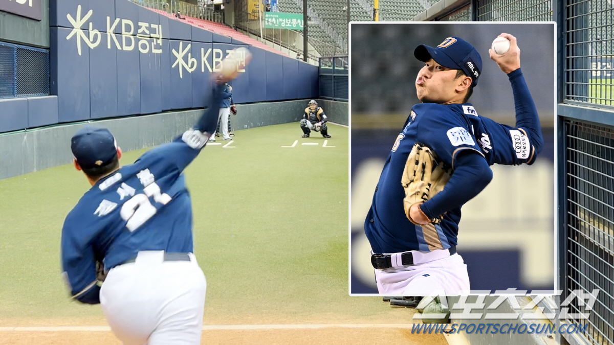마운드에 오르기 전 불펜에서 힘찬 투구를 선보인 김시훈의 모습을 영상으로 담았다.
