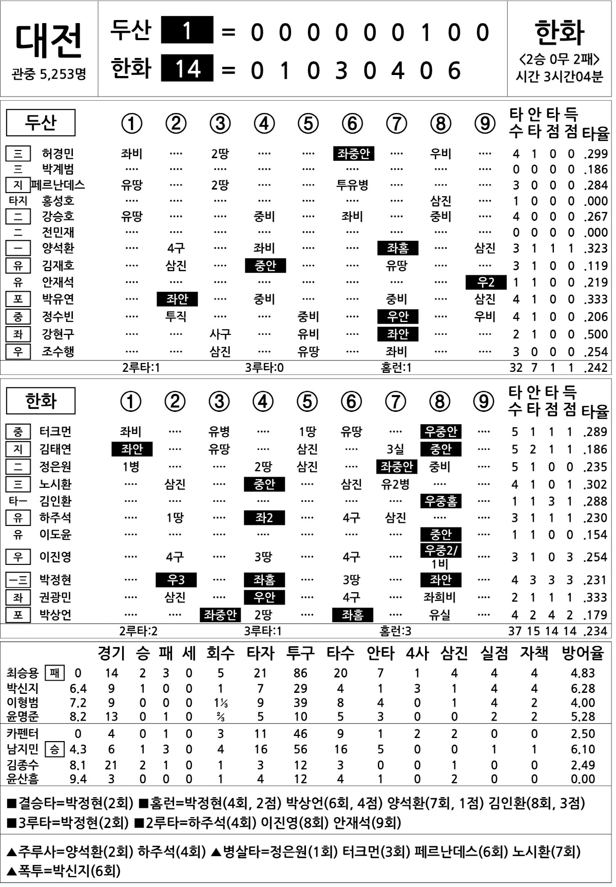 [2022 KBO리그 기록실] 두산 vs 한화 (5월 25일)
