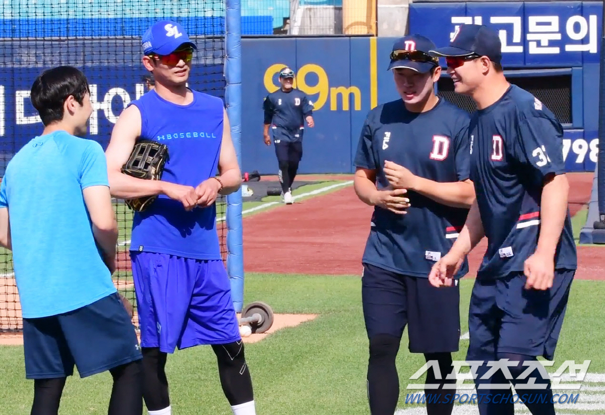 두산 허경민은 김지찬에게 다가가 한참 동안 대화를 나눴다. 김지찬의 방망이도 살펴보며 무럭무럭 상장하고 있는 김지찬이 대견스러운 듯 웃어 보였다.