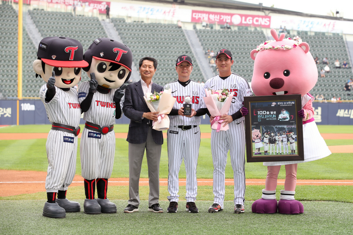 류 감독은 KBO 통산 49번째 100승 사령탑이 됐다. 이날 기념식에선 주장 오지환이 선수단을 대표해 꽃다발로 축하를 전했다. 구단 수뇌부 역시 기념 액자와 꽃다발로 축하와 감사를 전했다. 류 감독 역시 선수단과 구단 프런트를 위한 햄버거 세트로 화답했다.